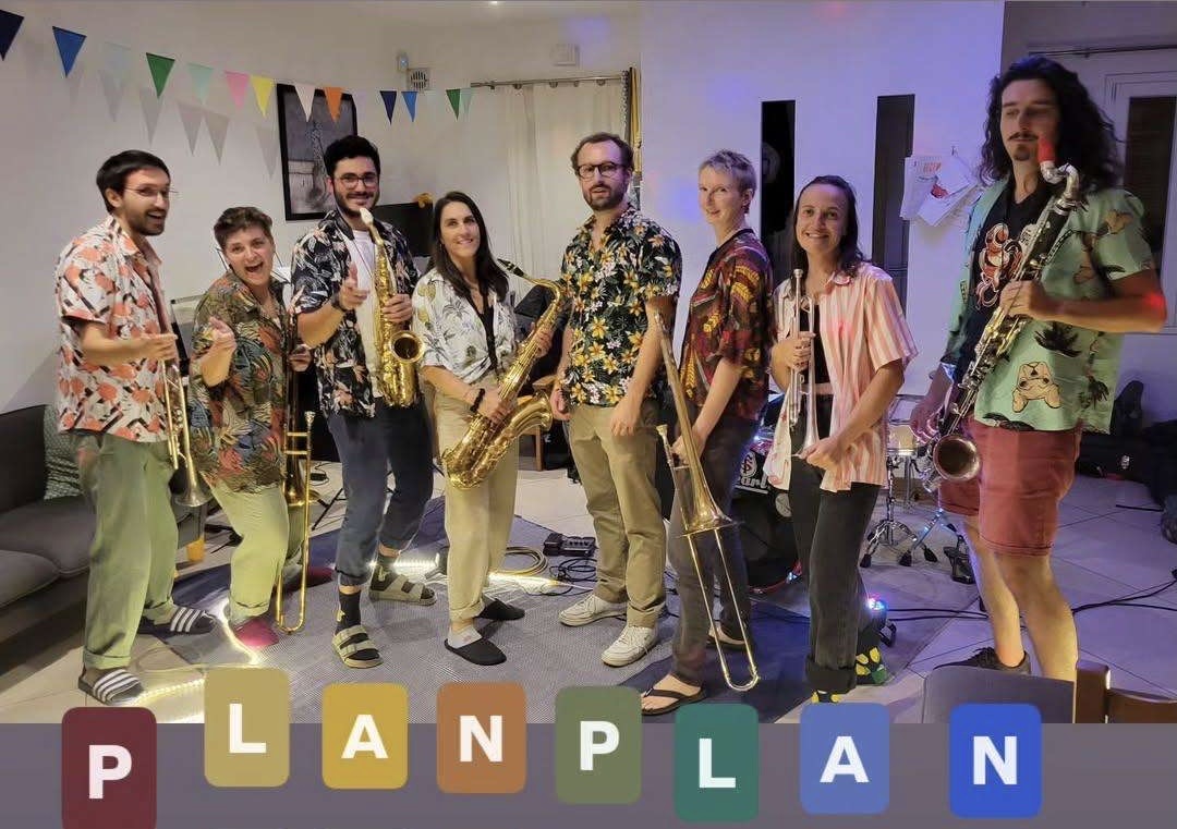 La fanfare PLANPLAN, c’est la fanfare chill, qui ne s’affole pas, et qui joue de l’électro/drum and b(r)ass ! On joue à 3h du mat’ quand plus personne n’a la force, mais on est aussi capables de jouer à 18h pétantes (jamais pressé·e·s bien sûr, mais toujours à l’heure).